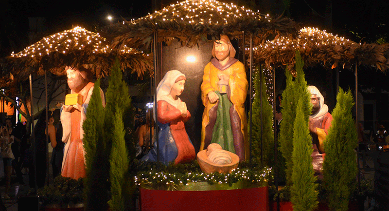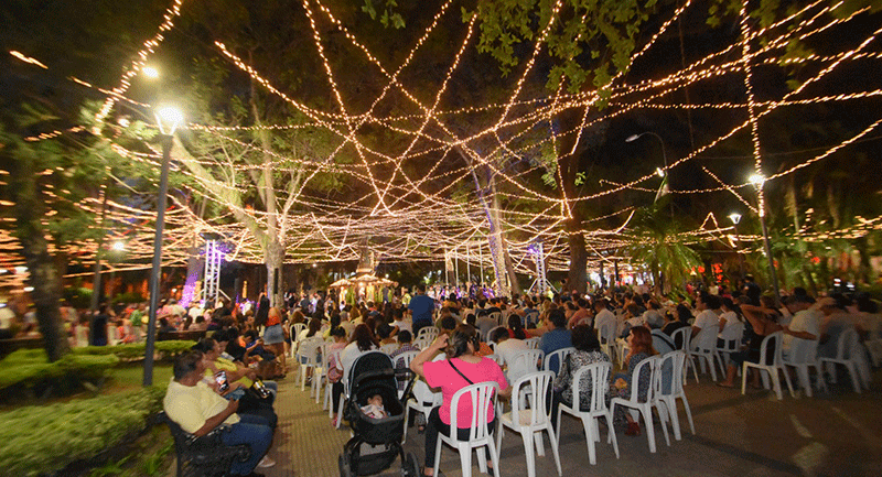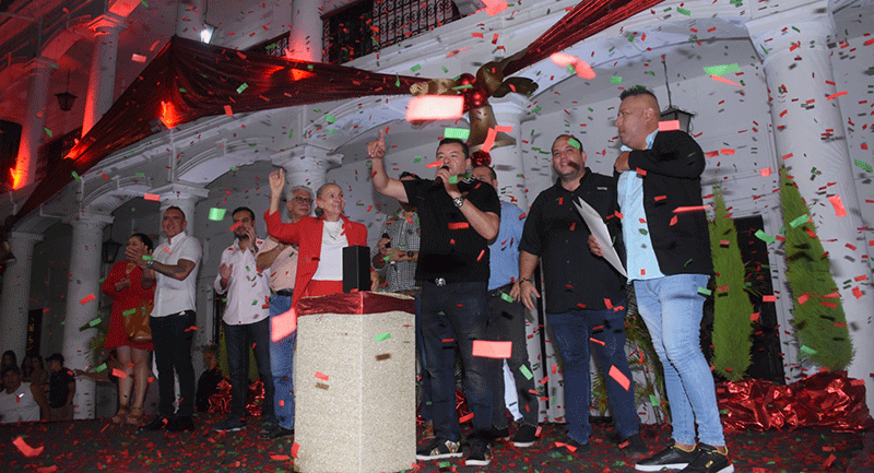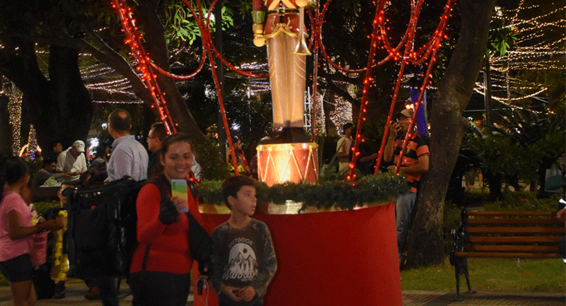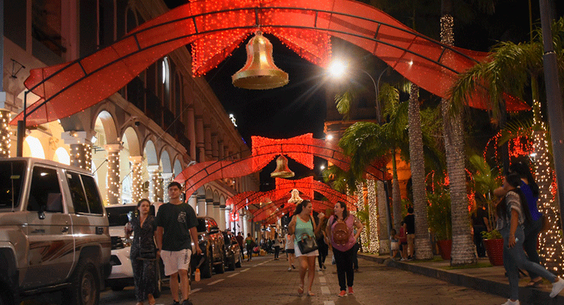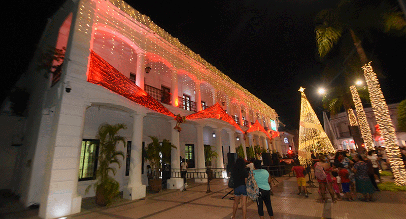 Alcalde Jhonny Fernández inaugura tradicional encendido de luces navideñas con entrega de regalos en la plaza 24 de Septiembre. El encendido de las luces y los fuegos pirotécnicos hicieron que la noche fuera mágica para las familias que se dieron cita, quienes disfrutaron de la hermosa decoración denominada "din don dan" que este año estuvo a cargo del afamado decorador Quito Velasco.