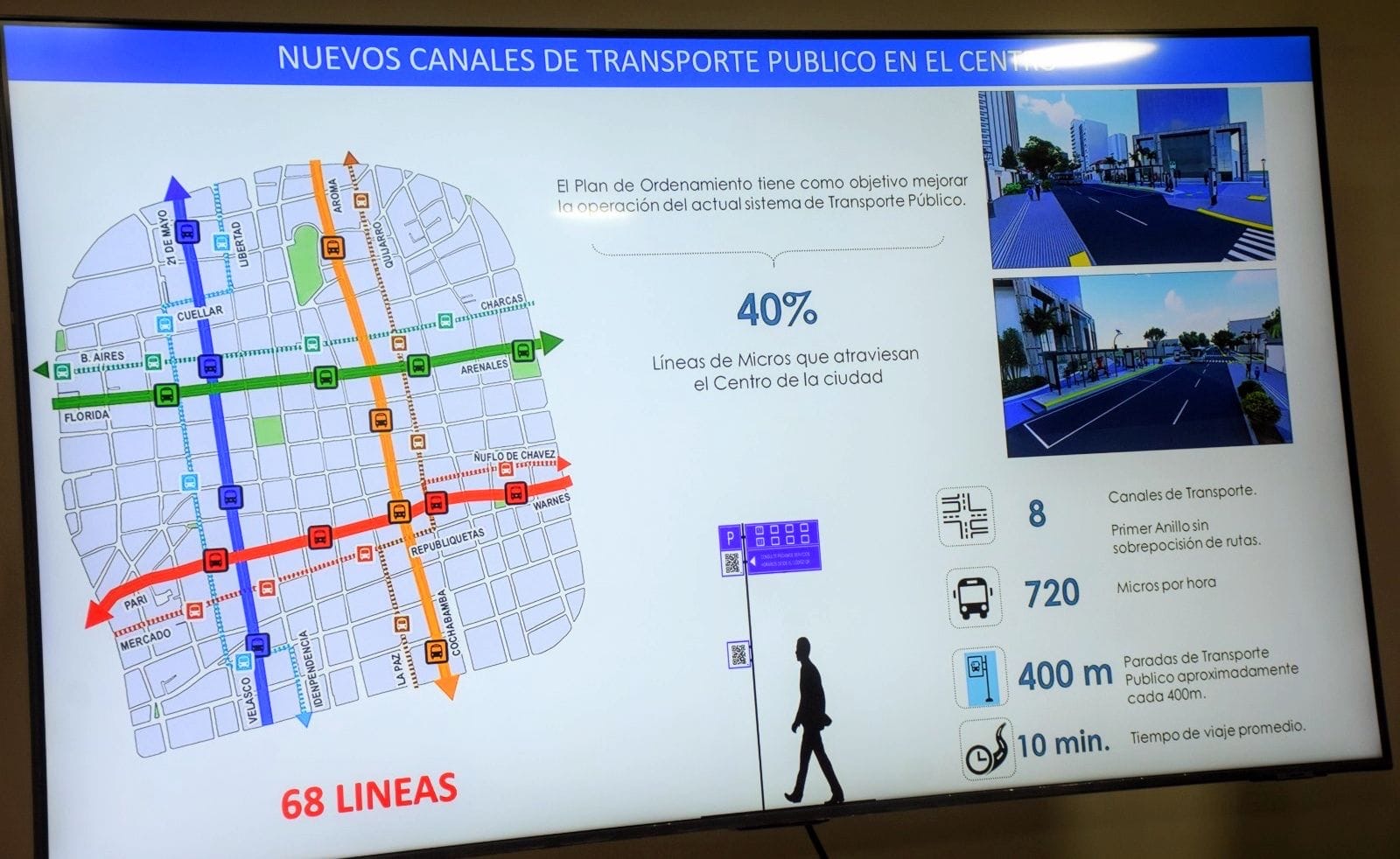 Como parte del plan, 68 de las 115 líneas de transporte público que actualmente circulan por el primer anillo podrán ingresar, mientras que 39 líneas ya no tendrán acceso a esta zona. Ocho canales de transporte, monitoreados por cámaras de vigilancia, serán implementados con 32 paradas establecidas a una distancia de 400 metros entre sí, facilitando el ascenso y descenso de pasajeros.